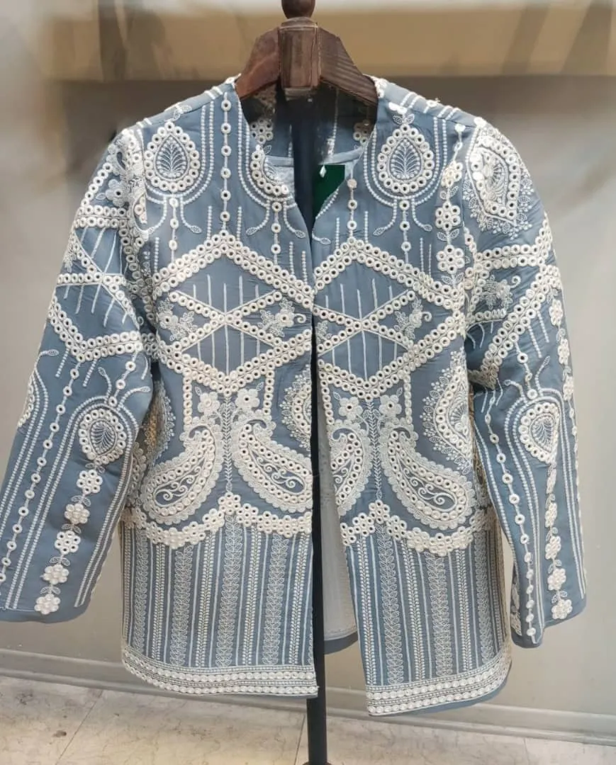 مانتوهای سوزن‌دوزی ترکیبی از هنر اصیل شرقی و مد روز هستند. هر تکه از این پارچه‌ها حاصل ساعت‌ها دوخت ظریف و خلاقانه است. این مدل خاص، با زمینه آبی و سوزن دوزی سفید، هم برای استایل‌های روزمره و هم برای دورهمی‌ها انتخابی چشمگیر است.