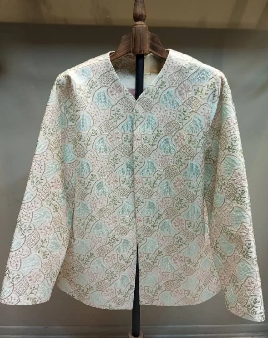 کت سوزندوزی طرح مهرآوید، انتخابی چشمنواز برای خانمهایی است که به دنبال تلفیق هنر ایرانی با استایل روز دنیا هستند. این کت با پارچهی سوزندوزی آبی و کرم روی زمینه کرم و طراحی خاص ، جلوهای خاص و متفاوت به استایل شما میبخشد.