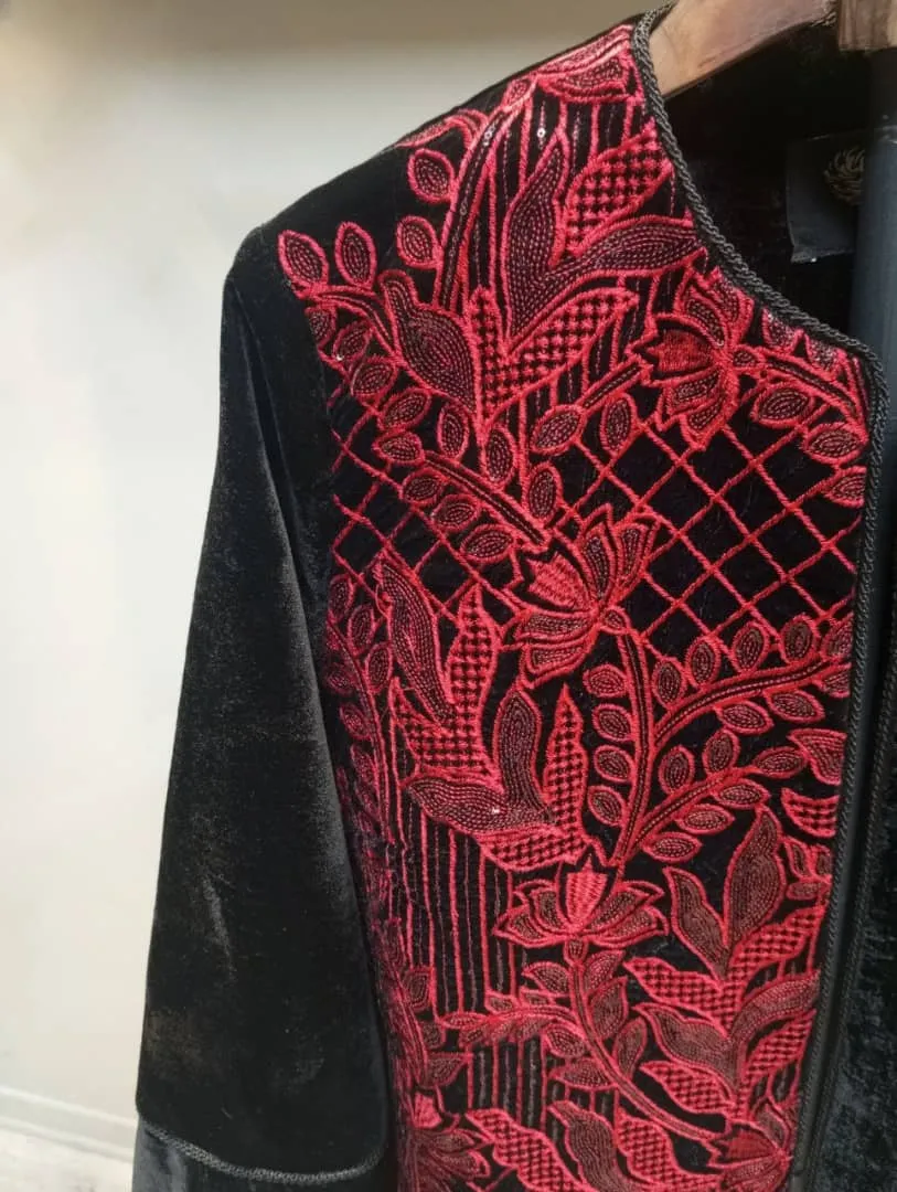 این کت خاص را میتوانید با شلوار یا دامن مشکی و شال تک رنگ ساده ست کنید تا سوزندوزی قرمز جلوه بیشتری پیدا کند.
