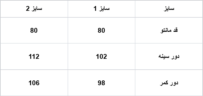 سایز 2: دور سینه 112 | دور کمر 106 | قد مانتو 80