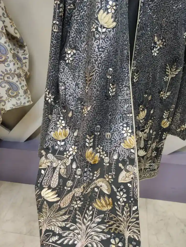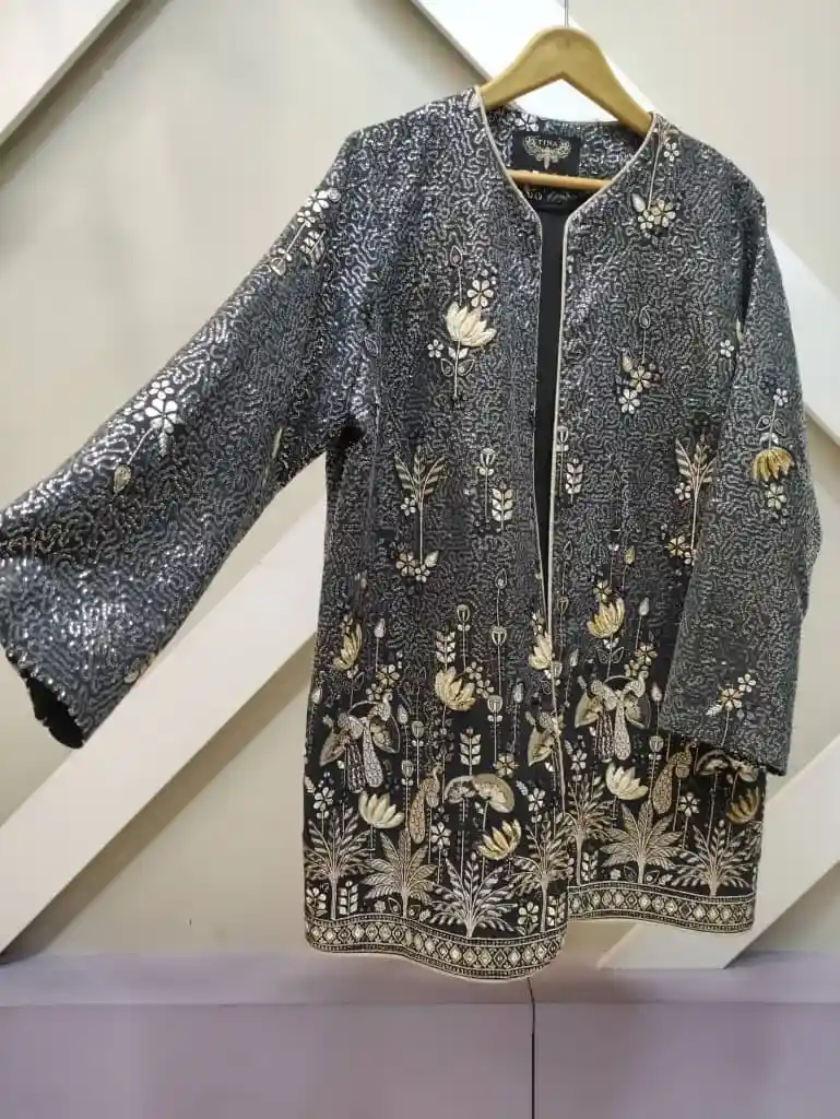 این کت حریر هندی سوزن دوزی با طراحی زیبا و سوزندوزیهای طلایی، ظاهری لوکس و شیک به شما میبخشد و گزینهای عالی برای هر مناسبت خاص است.