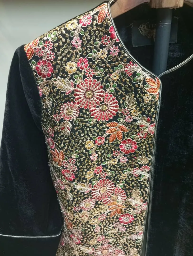 کت مخمل مشکی سوزن دوزی با طرح گل و پرنده
