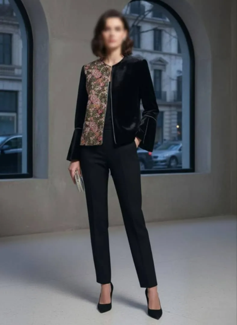 این کت خاص را می‌توانید با شلوار یا دامن مشکی و شال تک رنگ ساده ست کنید تا سوزن‌دوزی گلدار جلوه بیشتری پیدا کند.