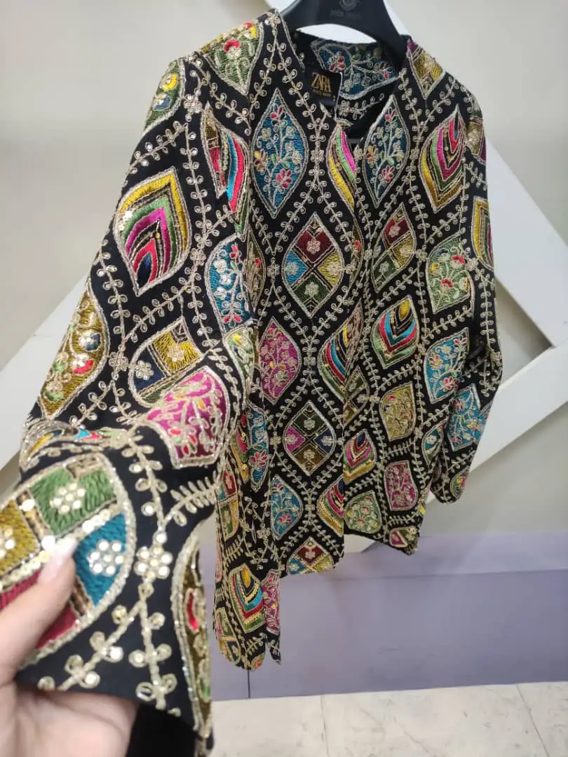 کت سوزن‌دوزی مشکی با هندی‌دوزی رنگی تلفیقی از هنر سنتی شرقی و طراحی مدرن است.