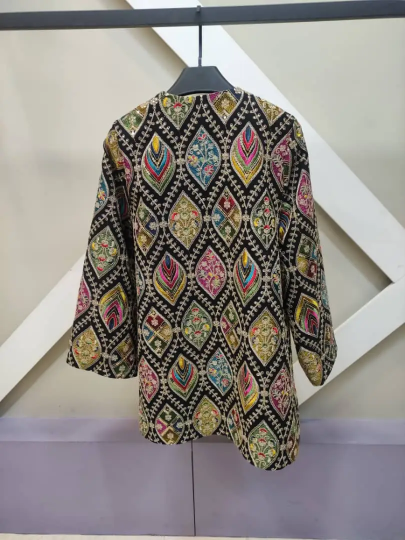اگر به دنبال لباسی هستی که تلفیقی از اصالت و سبک مدرن باشه، این کت سوزن‌دوزی مشکی یا به عبارتی مانتو سوزن‌دوزی مشکی با هندی‌دوزی رنگی دقیقاً همون چیزیه که استایلت رو خاص و متفاوت می‌کنه.