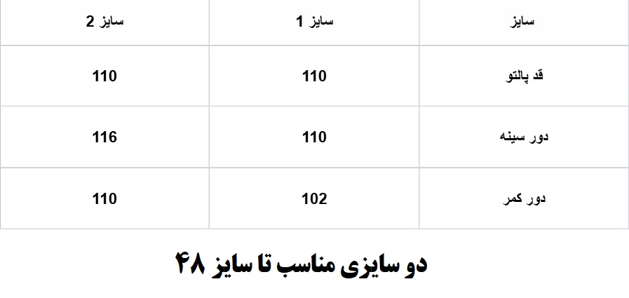 سایز ۲: قد ۱۱۰ سانتیمتر | دور سینه ۱۱۶ | دور کمر ۱۱۰