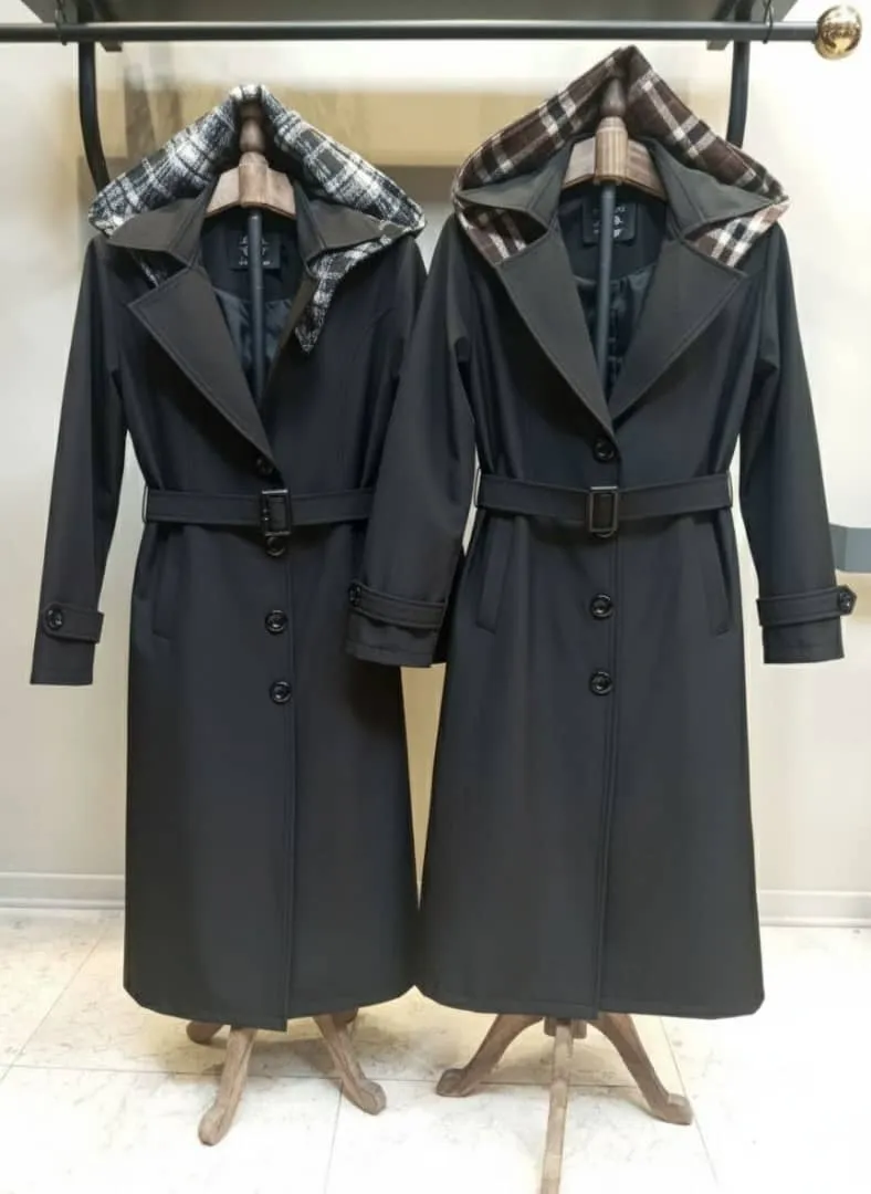 مدل: بارانی زنانه بلند با کلاه پشمی جداشونده